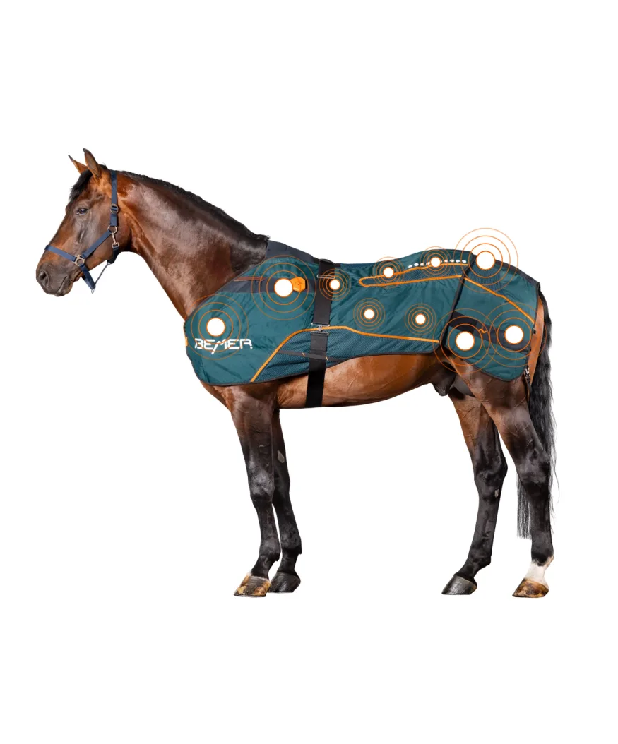 La coperta per cavalli è dotata di 19 bobine che trasmettono esattamente nel posto giusto il segnale BEMER nell’organismo del cavallo. Per ogni cavallo – di qualsiasi dimensione. Grazie alla lunghezza regolabile in continuo e al sistema di cintura intelligente, la coperta si adatta all’istante e perfettamente al vostro cavallo. E poiché l’unità di controllo è integrata nella coperta e alimentata a batteria, può essere integrata facilmente e senza complicazioni nella vostra routine giornaliera di stalla. L’astuto campo di scrittura bianco nella parte posteriore della coperta, sul lato interno, facilita l’identificazione.